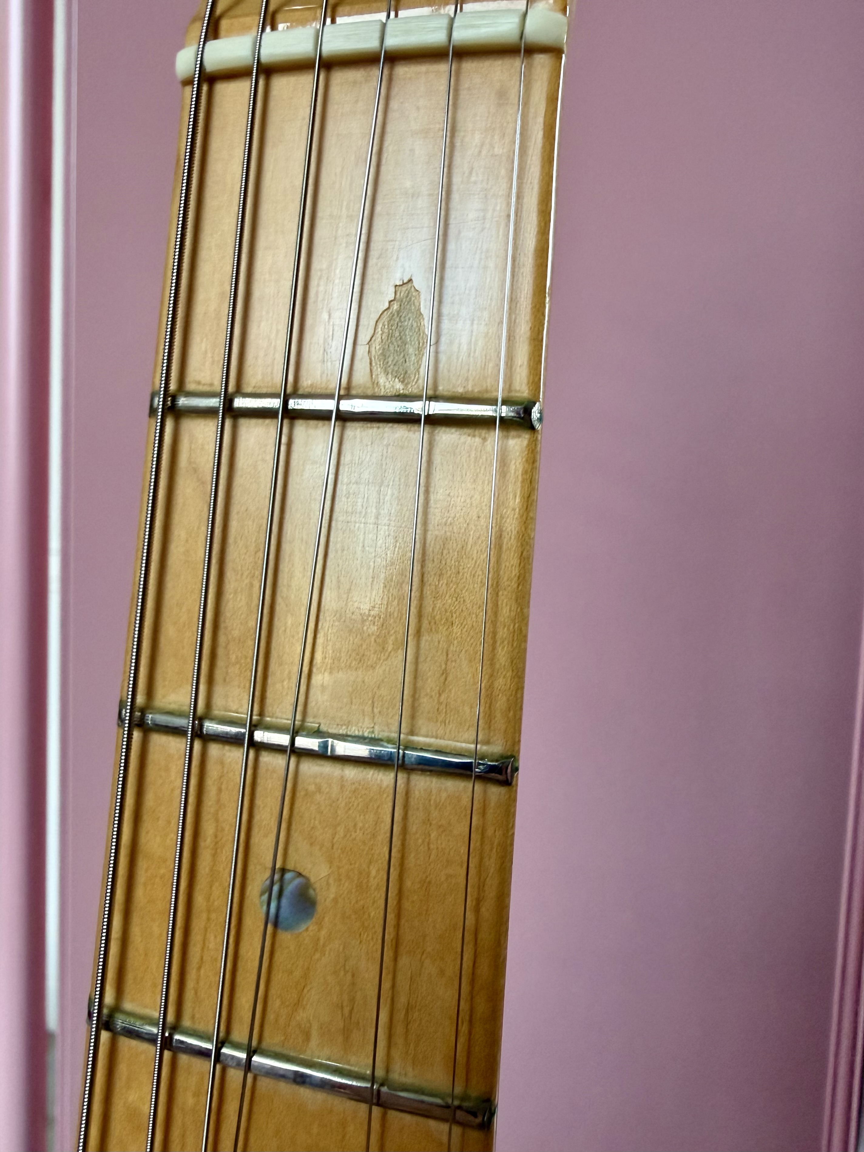 Есть следы использования: мелкие царапины и потёртости по корпусу и грифу, сколов на деке нет, но есть скол на грифе на первом ладу — всё на фото. Лады с износом, играть комфортно по всему грифу, но в перспективе возможен фрет-дрессинг. Критичных проблем нет: гитара строит, звучит, электроника без сюрпризов.
